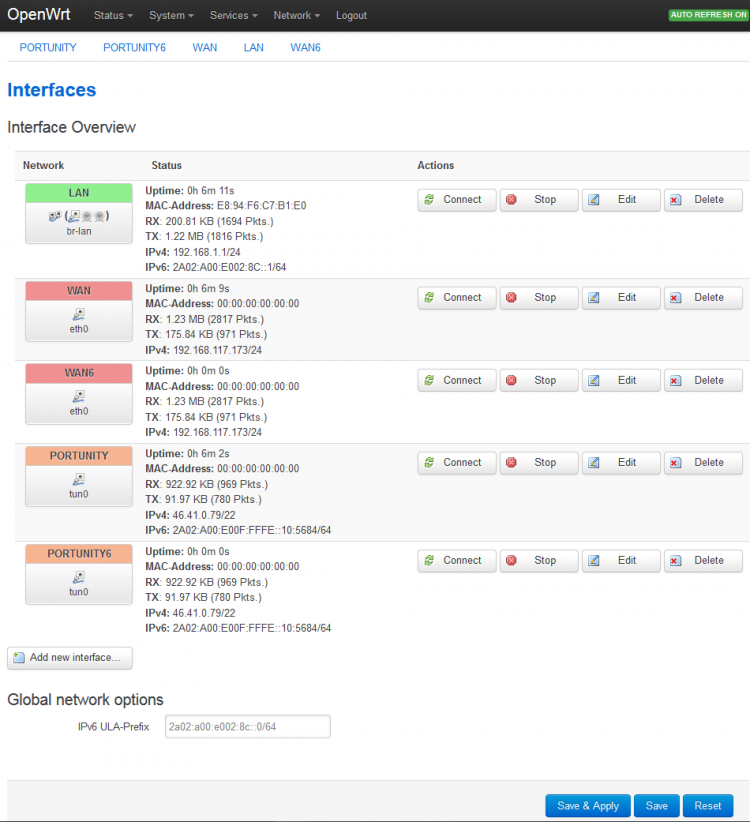 Und Interface „portunity6“ für IPv6 hinzufügen.