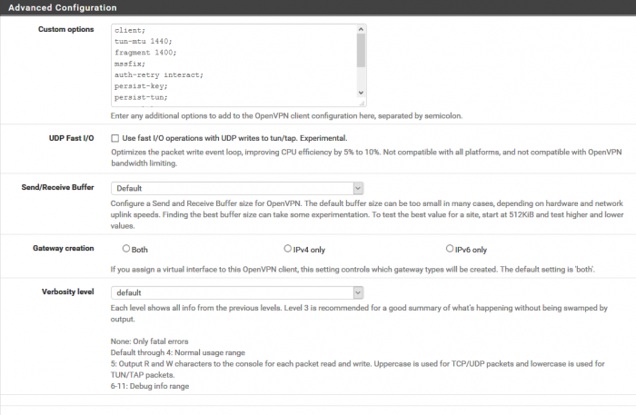 client; tun-mtu 1440; fragment 1400; mssfix; auth-retry interact; persist-key; persist-tun; remote-cert-tls server; verb 0; auth-user-pass /conf/portunity.login; redirect-gateway;